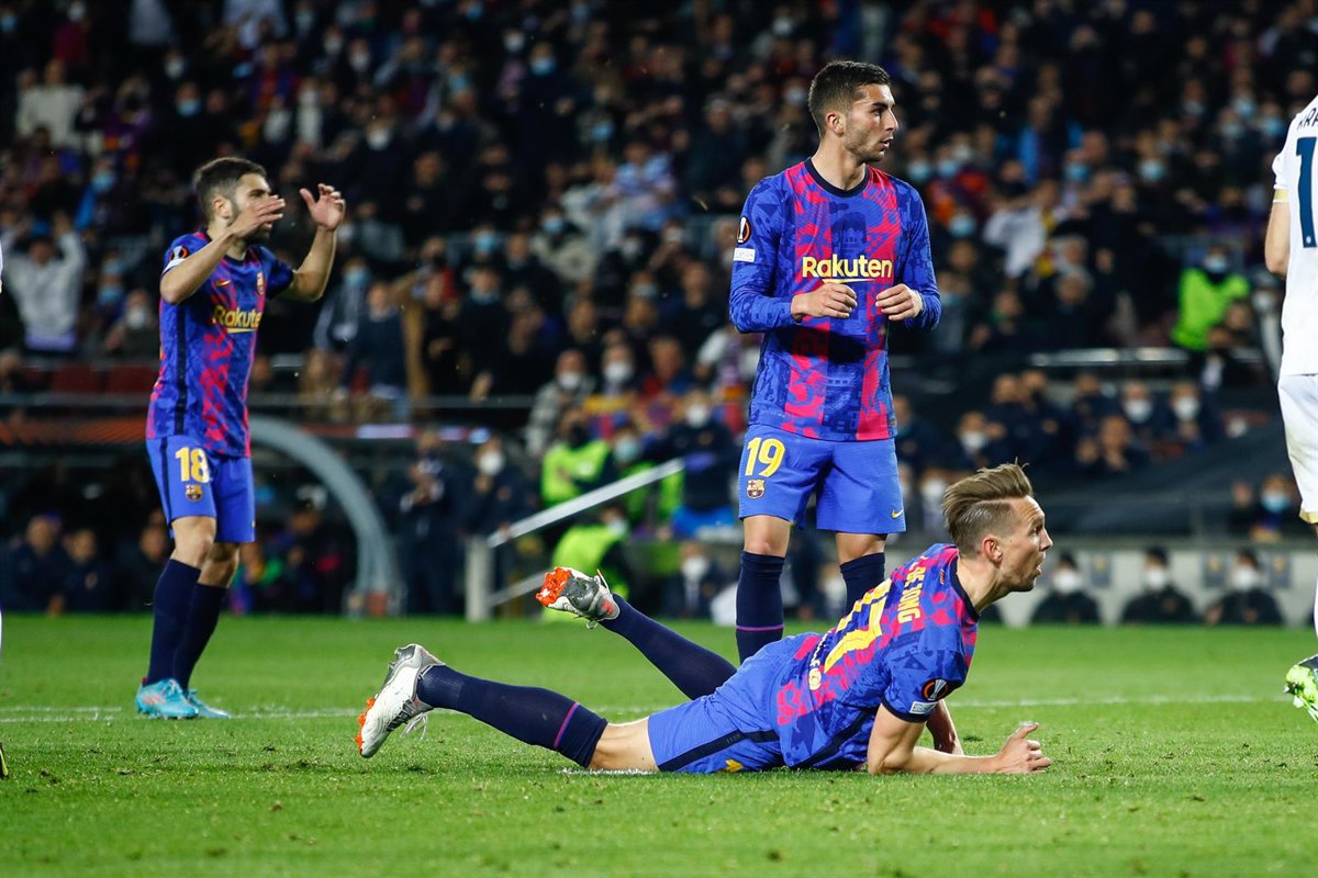 Luuk de Jong and Ferran Torres of FC Barcelona lament during the Europa League match between FC Barcelona and SSC Napoli at Camp Nou Stadium on February 17, 2022 in Barcelona. - Xavi Bonilla / AFP7 / Europa Press