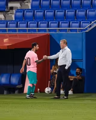 El jugador blaugrana Leo Messi y su entrenador en el FC Barcelona, Ronald Koeman, en el amistoso de pretemporada contra el Girona FC en el Estadi Johan Cruyff - FC BARCELONA
