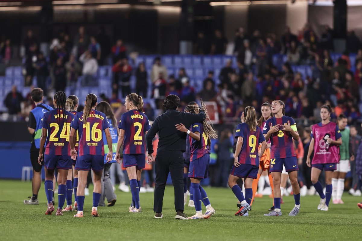 Jugadoras del Barça Femení celebran el triunfo ante el Bayern de Múnich en la Champions Femenina 2025/26 - Javier Borrego / AFP7 / Europa Press