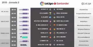 La jornada se abrirá el viernes 24 con el Getafe-Eibar y concluirá el lunes 27 con el Athletic-Huesca. Igual que ocurre con la jornada inaugural, que se disputará una semana antes, los horarios "podrán modificarse debido a la previsión de las temperaturas", según aclaró LaLiga.