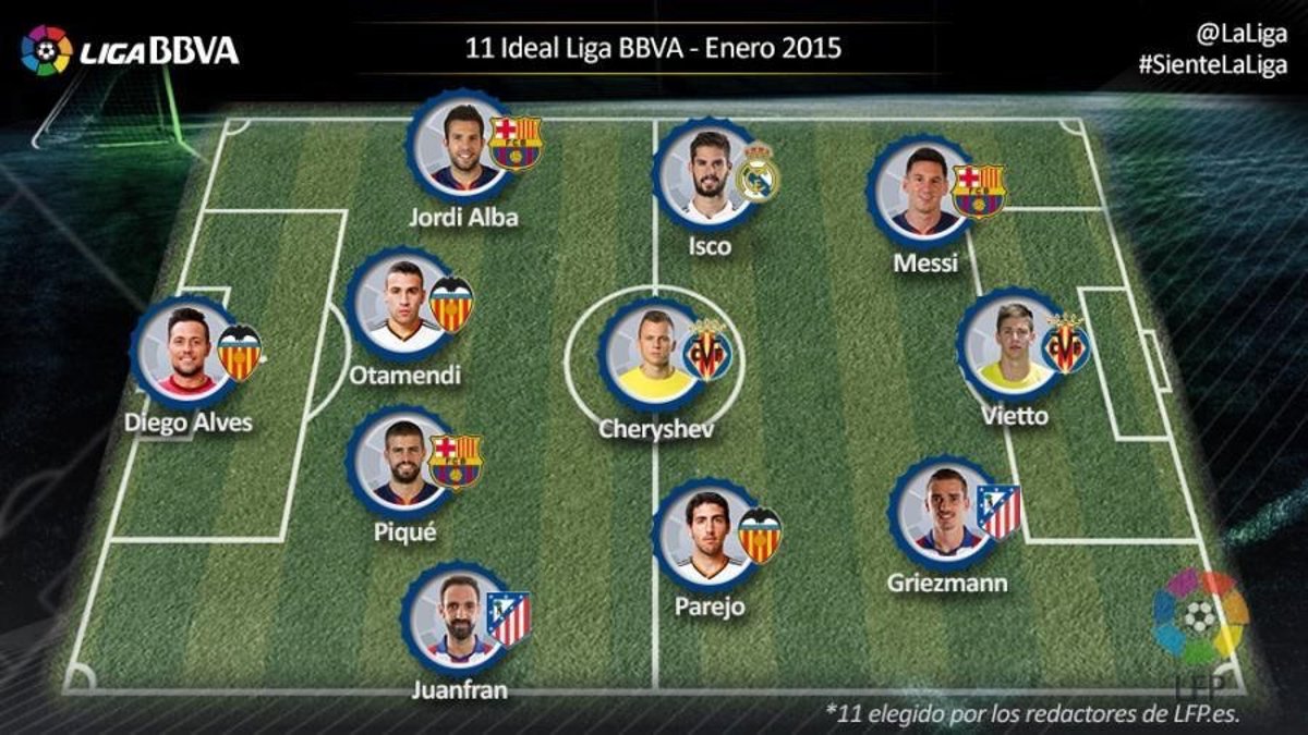 La alineación, elegida por los redactores de la web oficial de la LFP, está formada por Diego Alves en la portería; Juanfran Torres, Gerard Piqué, Nicolás Otamendi y Jordi Alba en defensa; Dani Parejo, Denis Cheryshev e Isco Alarcón en el centro del campo; y Antoine Griezmann, Leo Messi y Luciano Vietto en la delantera.