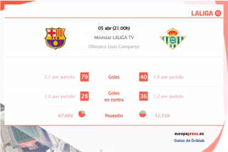 En el terreno ofensivo, el equipo 'culers' supera al equipo verdiblanco en goles por partido con 2,7 goles por encuentro del primero frente a 1,4 del segundo, según las estadísticas de Driblab consultadas por Europa Press. En cuanto a la calidad de las ocasiones de gol generadas, el equipo catalán también supera al equipo de Pellegrini con 1,8 goles esperados frente a 1,2.