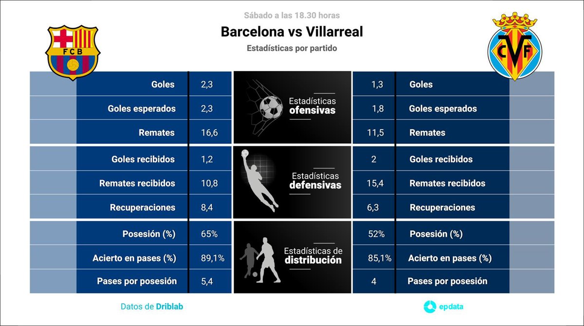 En el panorama ofensivo, el Barcelona mejora los registros del Villarreal en goles por partido con 2,3 goles por encuentro del primero frente a 1,3 del segundo, según las estadísticas de Driblab consultadas por Europa Press. En cuanto a la calidad de las ocasiones de gol generadas, los culers también superan a los 'groguet' con 2,3 goles esperados frente a 1,8.