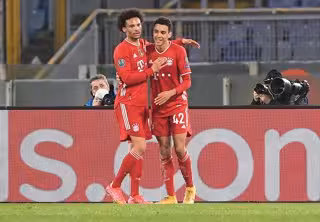 Jamal Musiala celebra junto a Leroy Sané su gol en el Lazio-Bayern de la ida de octavos de final de la Liga de Campeones 2020-2021 - Giuseppe Maffia/dpa