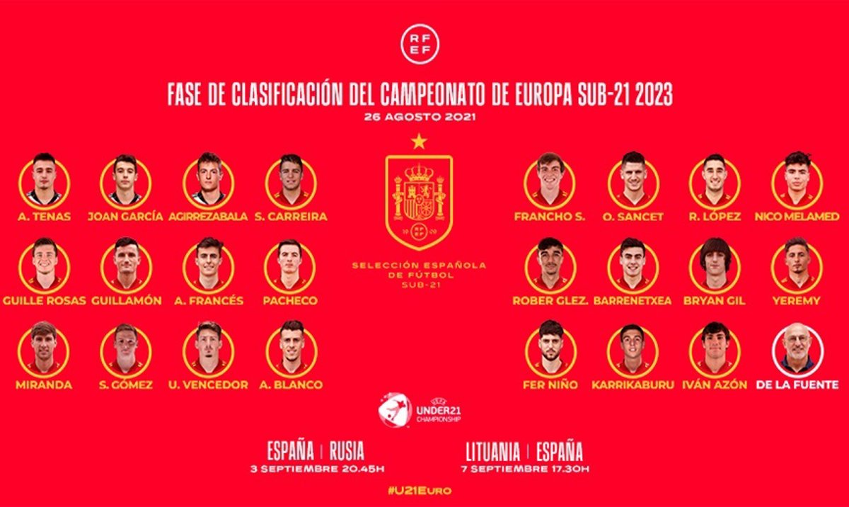 DELANTEROS: Nico Williams (Athletic Club), Ander Barrenetxea (Real Sociedad), Bryan Gil (Tottenham), Yeremi Pino (Villarreal), Fernando Niño (Mallorca), Jon Karrikaburu (Real Sociedad) e Iván Azón (Zaragoza).