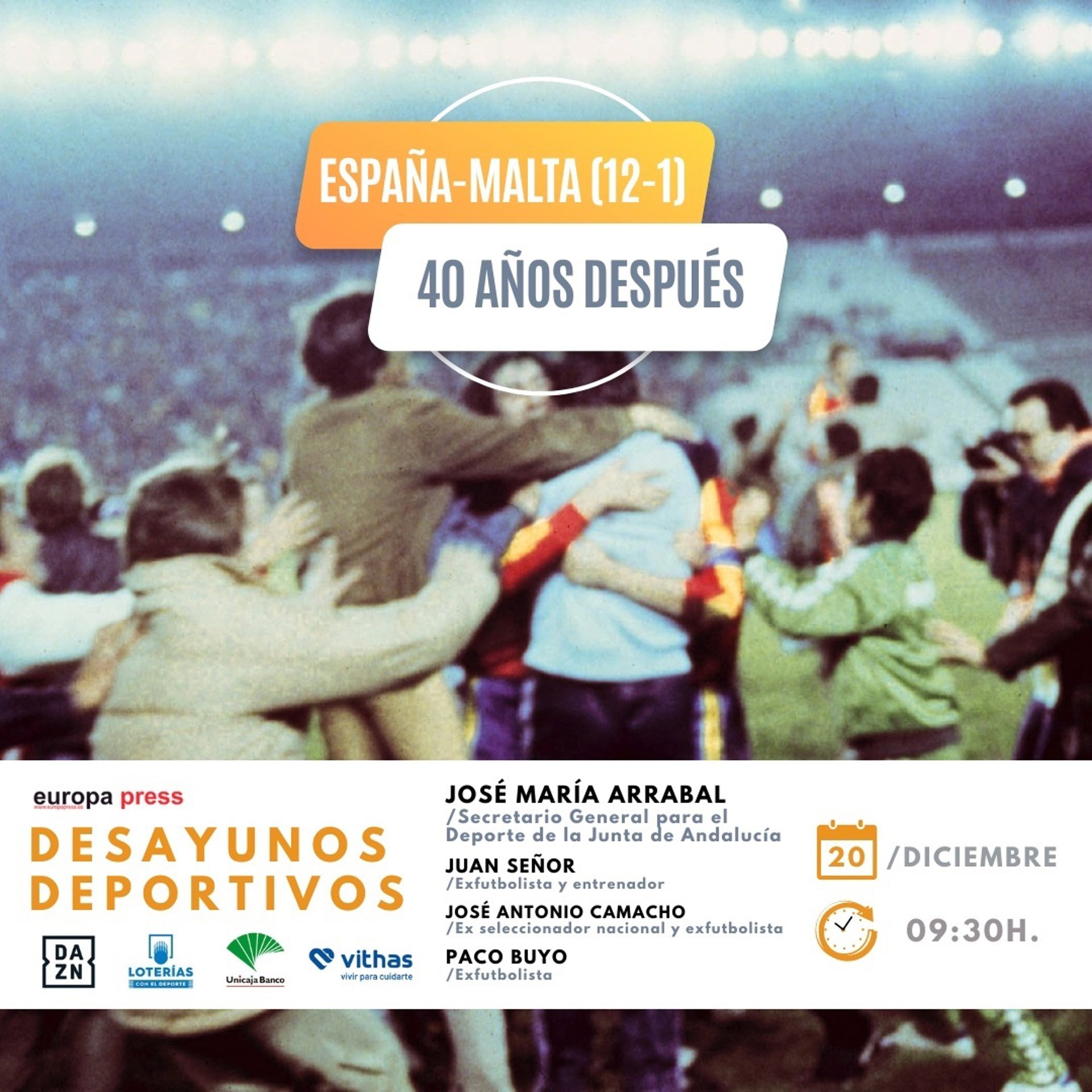 Los exfutbolistas Paco Buyo, José Antonio Camacho y Juan Señor, y la gesta del 12-1 de España a Malta 40 años después de aquel 21 de diciembre de 1983 en el Benito Villamarín de Sevilla serán los protagonistas este miércoles (9:30 horas) de los Desayunos Deportivos de Europa Press.