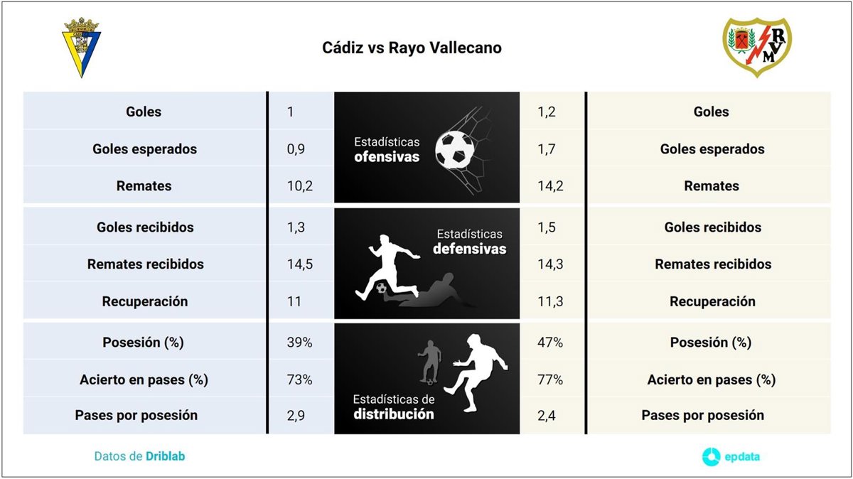 En el ámbito ofensivo, el Rayo Vallecano supera al Cádiz en goles por partido, con 1,2 goles por encuentro del primero frente a 1 del segundo. En cuanto a la calidad de las ocasiones de gol generadas, el Rayo Vallecano también supera al Cádiz con 1,7 goles esperados frente a 0,9, según las estadísticas de Driblab consultadas por Europa Press.