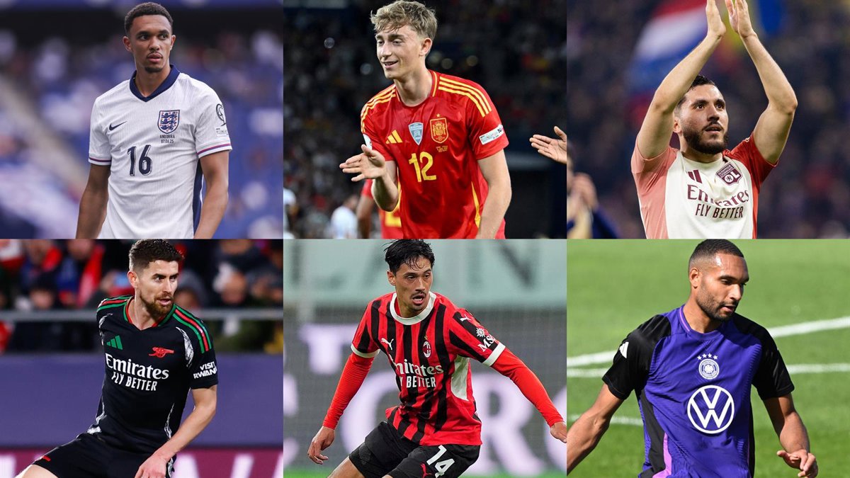 Los jugadores del Real Madrid Alexander-Arnold y Dean Huijsen (arriba izquierda y centro), del Manchester City Rayan Cherki (arriba derecha) y Tijjani Reijnders (centro abajo), del Flamengo Jorginho (izquierda abajo), y del Bayern Jonathan Tah. - EUROPA PRESS / DPA