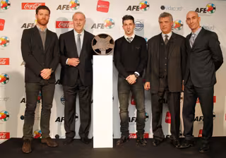 El presidente de la Real Federación Española de Fútbol, Ángel María Villar, y el seleccionador nacional, Vicente Del Bosque, miembros fundadores, junto con los campeones del mundo David Villa y Xabi Alonso y el presidente de la Asociación de Futbolistas Españoles (AFE), Luis Manuel Rubiales, han descubierto este lunes una escultura conmemorativa de la inauguración de la nueva sede de AFE en Madrid.