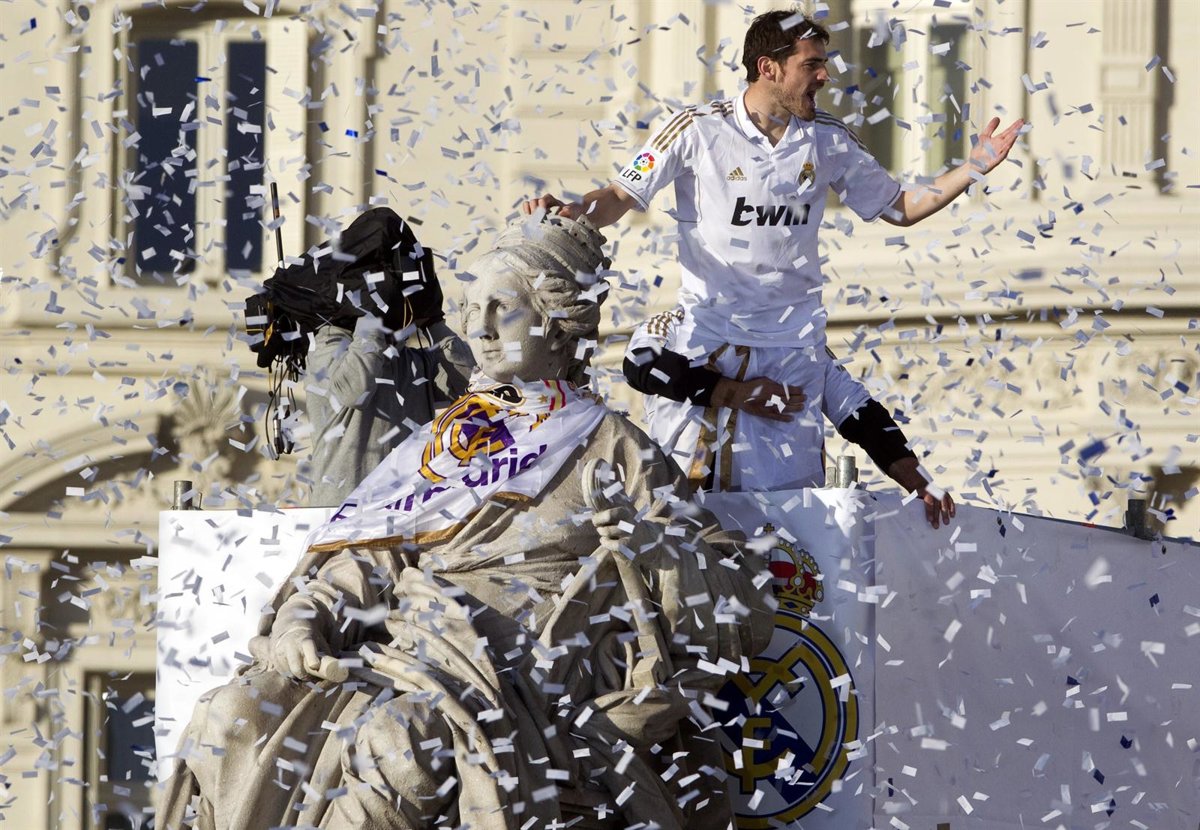 El capitán madridista, Iker Casillas, se ha aupado a la diosa Cibeles para brindar el trigésimo segundo título de la Liga Española conquistado por el conjunto blanco, en presencia de miles de aficionados madridistas que atestaron los aledaños de la Plaza de Cibeles.