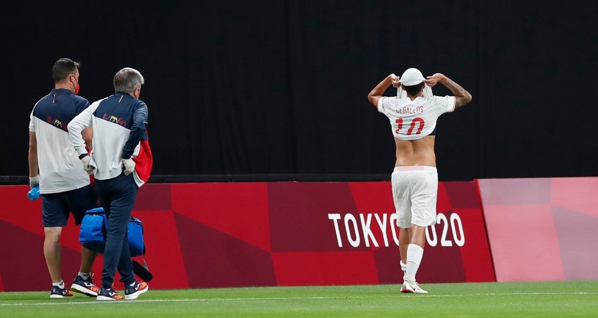 Ceballos en el momento de dejar el campo por su lesión en el tobillo durante el Egipto-España de los Juegos Olímpicos de Tokio - RFEF
