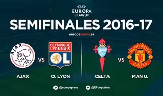 El RC Celta de Vigo se enfrentará al Manchester United en semifinales de la Europa League, según ha deparado el sorteo celebrado este viernes en Nyon (Suiza), mientras que Ajax de Ámsterdam y Olympique de Lyon disputarán la otra eliminatoria.