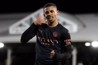 13 March 2021, United Kingdom, London: Manchester City's Gabriel Jesus celebrates scoring his side's second goal during the English Premier League soccer match between Fulham and Manchester City at Craven Cottage. Photo: Catherine Ivill/PA Wire/dpa - Catherine Ivill/PA Wire/dpa