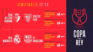 Por su parte, la otra semifinal CA Osasuna-Athletic Club se jugará el 1 de marzo (21:00 horas) en el estadio de El Sadar, mientras que la vuelta tendrá lugar el martes 4 de abril (22:00 horas) en el de San Mamés.