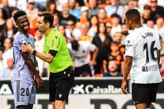Vinícius Junior sonríe ante De Burgos de Bengoetxea durante el Valencia-Real Madrid - Ivan Terron / Afp7 / Europa Press