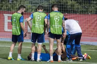 MADRID, 24 May. (EUROPA PRESS) - El jugador del Real Madrid Cristiano Ronaldo se ha tenido que retirar este martes del entrenamiento del conjunto blanco tras sufrir un choque con su compañero Kiko Casilla, cuatro días antes de la final de la Liga de Campeones. El delantero portugués, que ya el sábado pasado no disputó el partidillo que realizó el conjunto blanco por precaución, se marchó del campo con gesto serio y lanzando una botella con rabia tras ver que podría peligrar su participación ante el Atlético de Madrid en la final de Milán. Además del inesperado infortunio de Cristiano Ronaldo, al entrenamiento del Real Madrid se sumó la baja ya conocida del francés Raphael Varane, quien parece que se perderá la final de 'Champions' por lesión. Por su parte, James Rodríguez y Álvaro Arbeloa, que también eran en un principio duda para la final de Milán, completaron el entrenamiento junto a sus compañeros sin ningún problema.