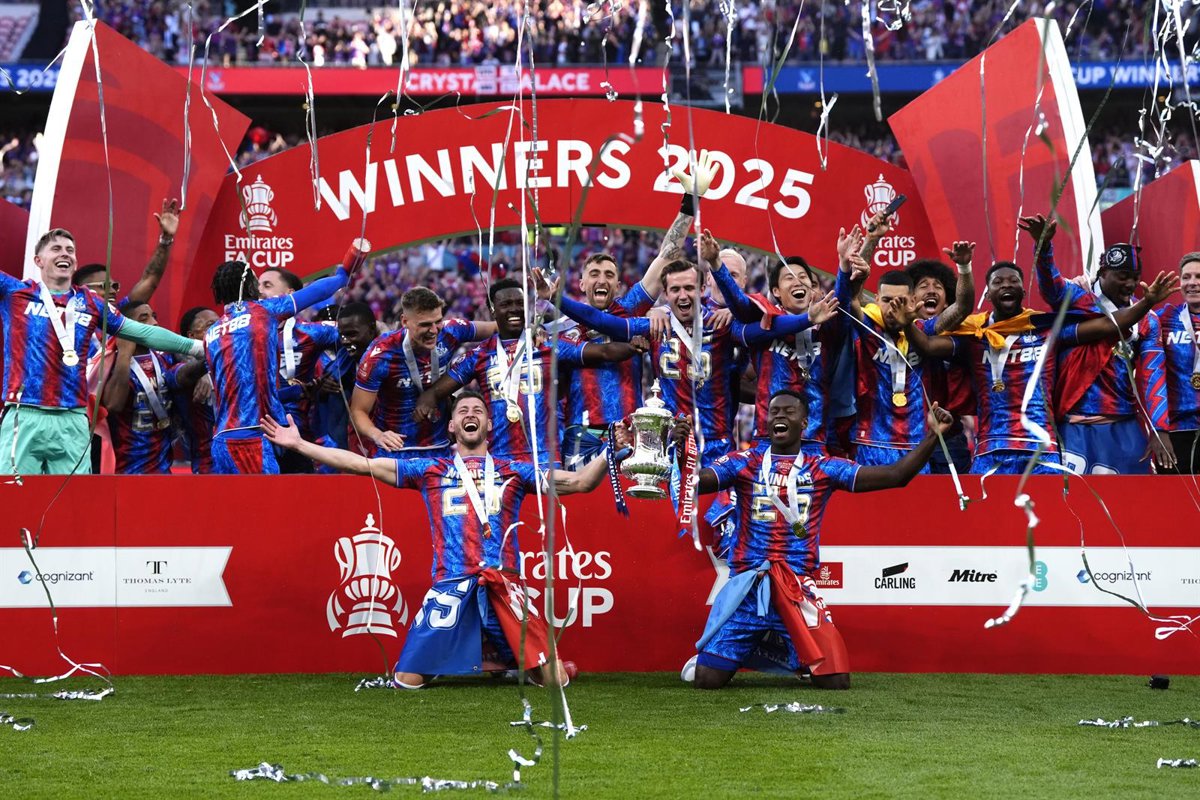 17 May 2025, United Kingdom, London: Crystal Palace playeres celebrate with the trophy following the English FA Cup final soccer match between Manchester City and Crystal Palace at Wembley Stadium. Photo: Nick Potts/PA Wire/dpa - Nick Potts/PA Wire/dpa