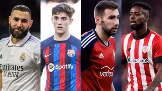Los futbolistas Karim Benzema (Real Madrid), Gavi (FC Barcelona), Jon Moncayola (Osasuna) e Iñaki Williams (Athletic Club). - EUROPA PRESS