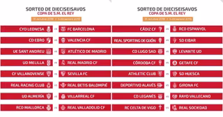 El sorteo de los dieciseisavos de final de la Copa del Rey ha deparado este viernes los emparejamientos Cultural Leonesa-FC Barcelona, Melilla-Real Madrid y Sant Andreu-Atlético de Madrid.