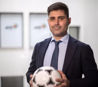 Archivo - El presidente de la Asociación de Futbolistas Españoles (AFE), David Aganzo, posa con un balón de fútbol en la sede del sindicato en Madrid. - AFE - Archivo