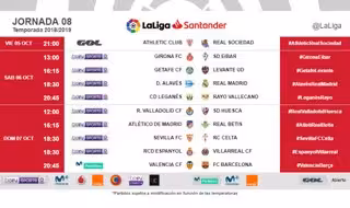 El derbi vasco entre Athletic Club y Real Sociedad abrirá el viernes 5 de octubre a las 21.00 horas la jornada 8 de LaLiga Santander, que terminará con el enfrentamiento entre Valencia CF y FC Barcelona en Mestalla el domingo 7 a las 20.45.