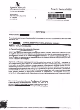 Gestifute, la empresa de Jorge Mendes, salió al paso de las informaciones publicadas este viernes, pertenecientes a la red europea EIC, para confirmar que el jugador portugués del Real Madrid está al día de sus obligaciones fiscales y, por tanto, no tiene problemas con el fisco. Para ello presentó un documento de Hacienda que asegura que Cristiano se encuentra al "corriente" con sus obligaciones.