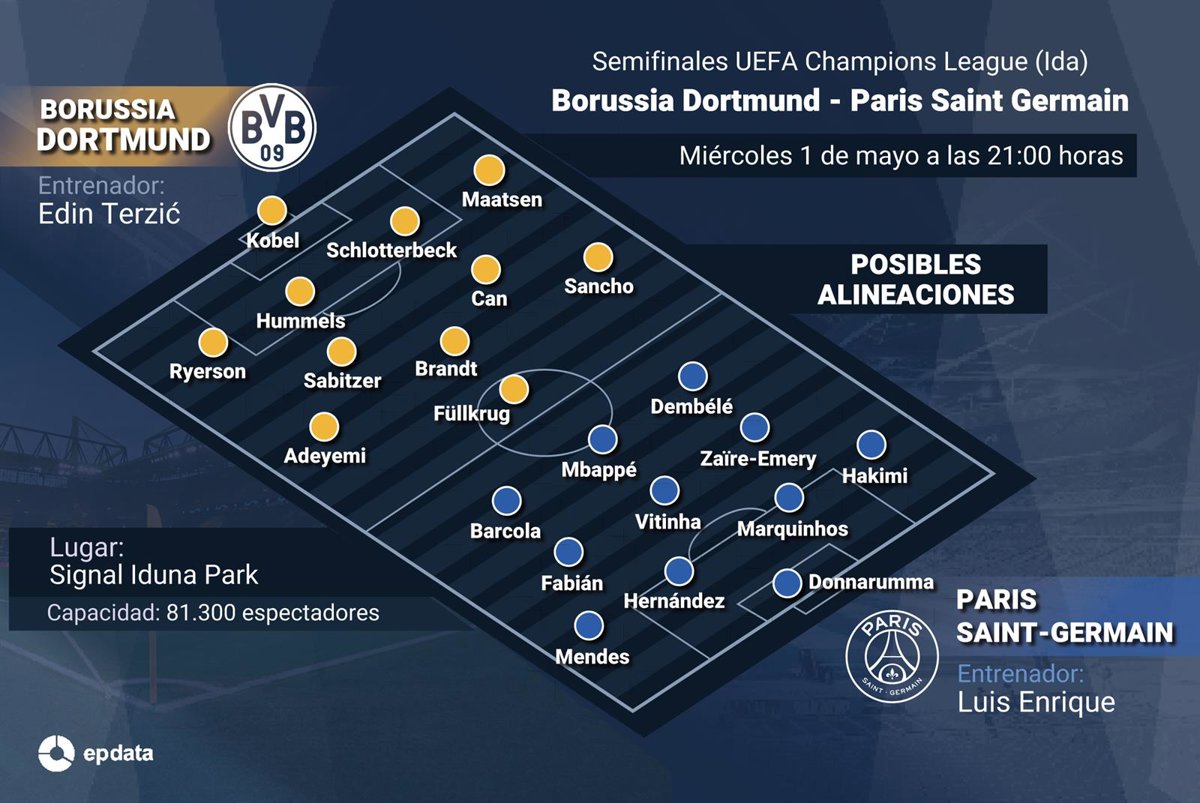 Borussia Dortmund y Paris Saint-Germain se miden este miércoles en el Signal Iduna Park (21.00) en la ida de semifinales de la Liga de Campeones 2023-2024, un primer encuentro en el que los alemanes buscan mantener su condición de invictos como locales en la competición y obtener ventaja de cara a la vuelta en la capital gala, mientras que los de Luis Enrique quieren celebrar el título liguero con su tercera victoria consecutiva a domicilio en Europa y acercarse a Wembley.