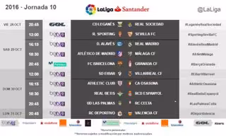 La Liga Santander ha anunciado este lunes los horarios de la décima jornada, en la que tanto el Real Madrid como el Barcelona jugarán el sábado 29 de octubre, los blancos en campo del Alavés (16.15 horas) y los azulgranas en casa ante el Granada (20.45).