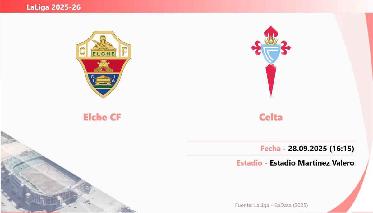 El Elche recibe este domingo al RC Celta en el Martínez Valero, en la jornada 7 de LaLiga EA Sports, un partido en el que los ilicitanos quieren lograr un triunfo que les permita continuar en puestos europeos, mientras que los gallegos quieren inaugurar su casillero de victorias, hasta el momento inmaculado este curso.