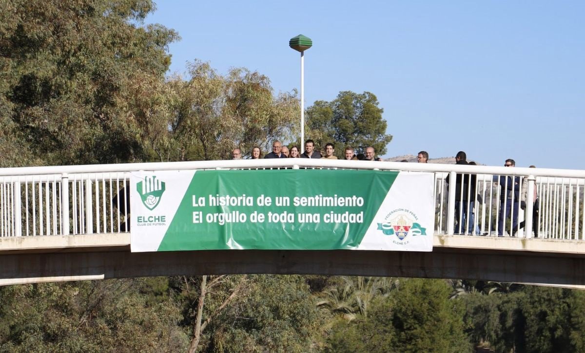 La Federación Peñas del Elche ha colocado una pancarta en el puente de la pasarela de Mercado en la que se puede leer: 'La historia de un sentimiento. El orgullo de toda una ciudad'. Esta acto da inicio a las actividades organizadas con el apoyo del Ayuntamiento y la Diputación de la Provincia de Alicante para homenajear al club ilicitano.