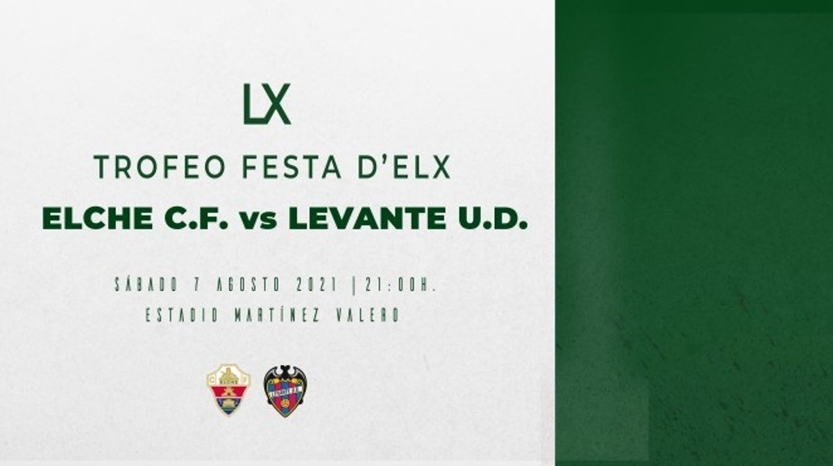 El Elche CF se enfrentará en un derbi regional al Levante en la LX edición del Trofeo Festa d'Elx, que se disputará el 7 de agosto a partir de las 21:00 horas en el Martínez Valero después del aplazamiento del pasado año debido a la pandemia de la COVID-19, informó el club ilicitano en su web oficial.