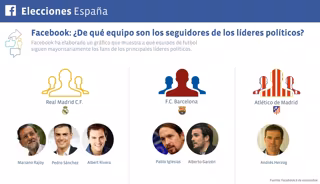 Con la campaña electoral por motivo de las elecciones generales del próximo 20 de diciembre, Facebook ha elaborado un pequeño estudio en el que muestra cuáles son los equipos de fútbol preferidos de los seguidores de varios de los líderes políticos de este país. Los políticos sobre los que se ha elaborado este estudio son: Mariano Rajoy, Pedro Sánchez, Albert Rivera, Pablo Iglesias, Alberto Garzón y Andrés Herzog.