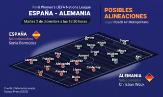 Si la futbolista 'gunner' no modifica su posición, la otra duda que puede haber en el once es si se mantendrá Esther González como punta de lanza o si Bermúdez opta por situar a Claudia Pina como 'falsa 9' como hiciese con éxito ante Suecia en busca de crear más problemas a las centrales alemanas y dar cobijo a una extremo más pura como Eva Navarro o Athenea del Castillo.