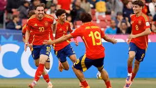 Iker Bravo (izquierda) celebra un gol con la selección española Sub-20 en el Mundial de la categoría. - RFEF