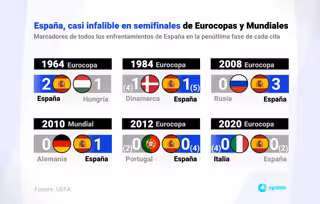El equipo que dirige Luis de la Fuente, tras su agónica y brillante victoria en cuartos de final ante Alemania el pasado viernes, afrontará por séptima ocasión una semifinal entre Eurocopa y Copa del Mundo, con un buen balance ya que de las seis anteriores, únicamente no la superó en la EURO de hace tres años, al caer por penaltis ante Italia.