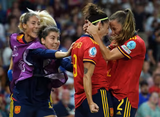 Esther González celebra con Ona Batlle su gol en los cuartos de final de la Eurocopa 2022 ante Inglaterra - Gareth Fuller/PA Wire/dpa