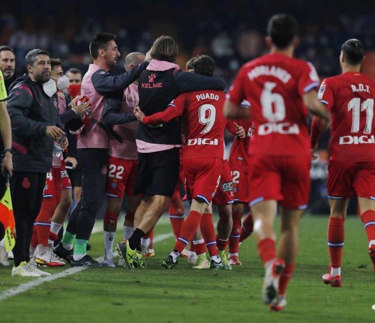 Los jugadores del Espanyol celebran el 1-2 de Javi Puado en Mestalla - PRENSA LALIGA