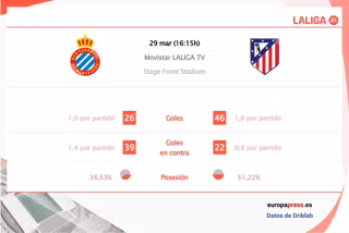 En el ámbito ofensivo, el conjunto de los rojiblancos mejora los registros de los pericos en goles por partido con 1,6 goles por encuentro del primero frente a 1 del segundo. En cuanto a la calidad de las ocasiones de gol generadas, los madrileños también superan a los catalanes con 1,2 goles esperados frente a 0,6, según las estadísticas de Driblab consultadas por Europa Press.
