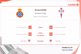 En el terreno ofensivo, el equipo celeste supera al perico en goles por partido con 1,6 goles por encuentro del primero frente a 0,9 del segundo. En cuanto a la calidad de las ocasiones de gol generadas, el equipo gallego también supera al catalán con 1,1 goles esperados frente a 0,7, según las estadísticas de Driblab consultadas por Europa Press.