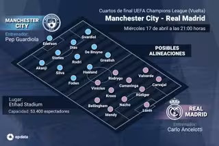El técnico italiano mantendrá su once, con la única variación de Nacho Fernández en el sitio del sancionado Tchouameni en el centro de la defensa, acompañando a un Rüdiger que tendrá de nuevo la misión de secar a Haaland, como ya hizo en la ida, y a un Foden desatado. El equipo blanco necesitará al Bellingham más determinante --no marca desde el 10 de febrero-- y a los entonados Vinícius y Rodrygo, que ya le ha hecho tres goles al City en eliminatorias de Champions.