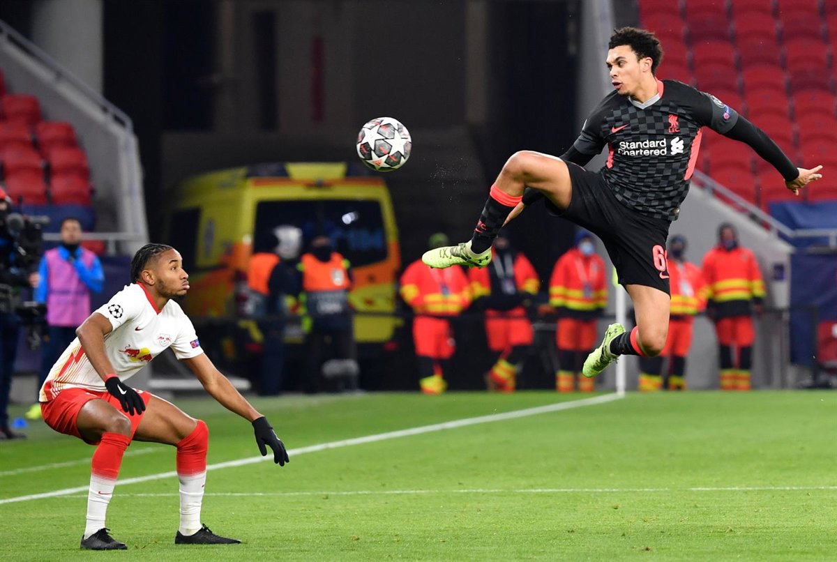Christopher Nkunku y Trent Alexander-Arnold en el Leipzig-Liverpool de la ida de octavos de Liga de Campeones - Marton Monus/dpa
