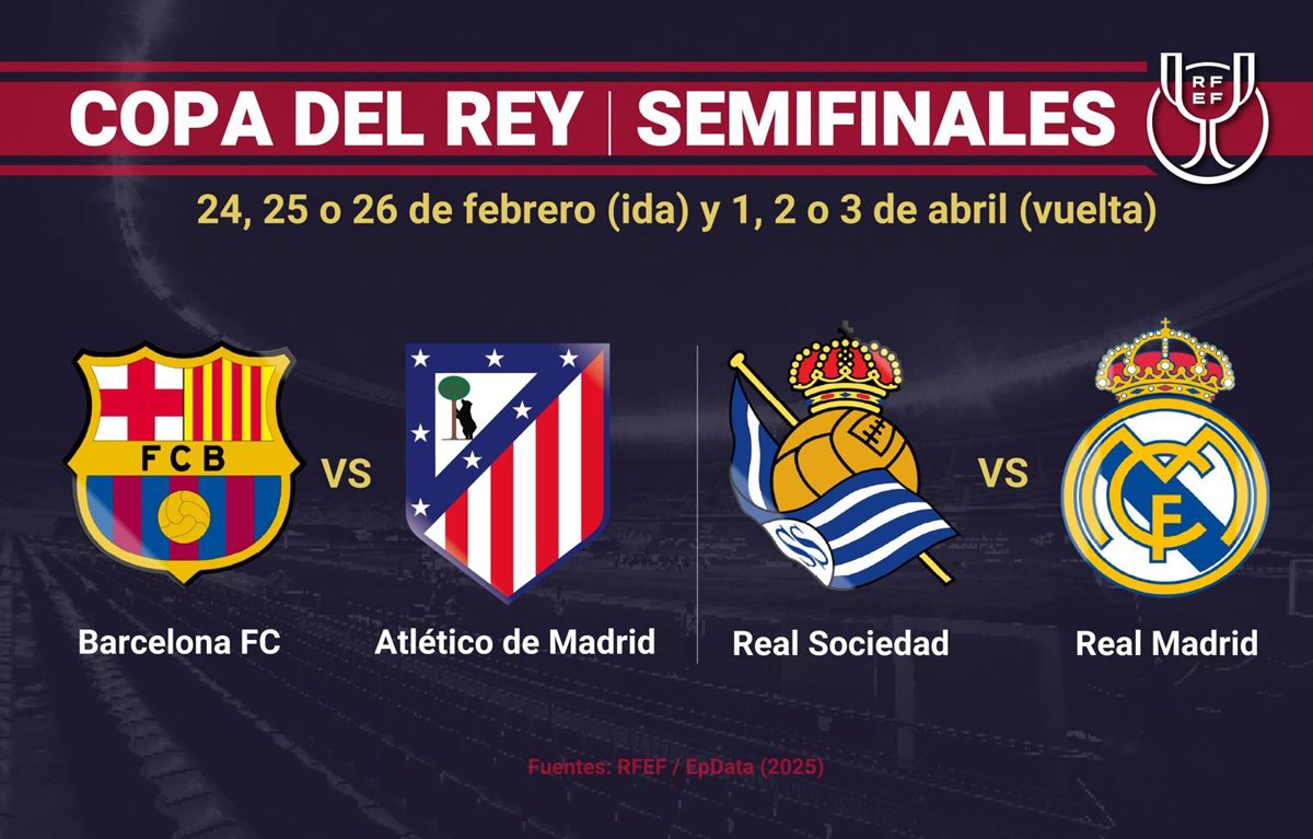 El otro duelo de semifinales enfrentará a la Real Sociedad, dos veces campeona y séptimo clasificado de LaLiga EA Sports, y al Real Madrid, actual líder doméstico, un cruce entre precisamente los dos equipos con menos descanso ya que ambos están jugando sus respectivos 'playoffs' de la Liga Europa, ante el Midtjylland danés, y de Champions ante el City.