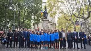 El presidente del FC Barcelona, Josep Maria Bartomeu, y el capitán Andrés Iniesta han encabezado este viernes la delegación del club en la ofrenda floral en el monumento de Rafael Casanova acompañado por miembros de la directiva y representantes de las secciones deportivas en la jornada de la Diada Nacional de Catalunya.