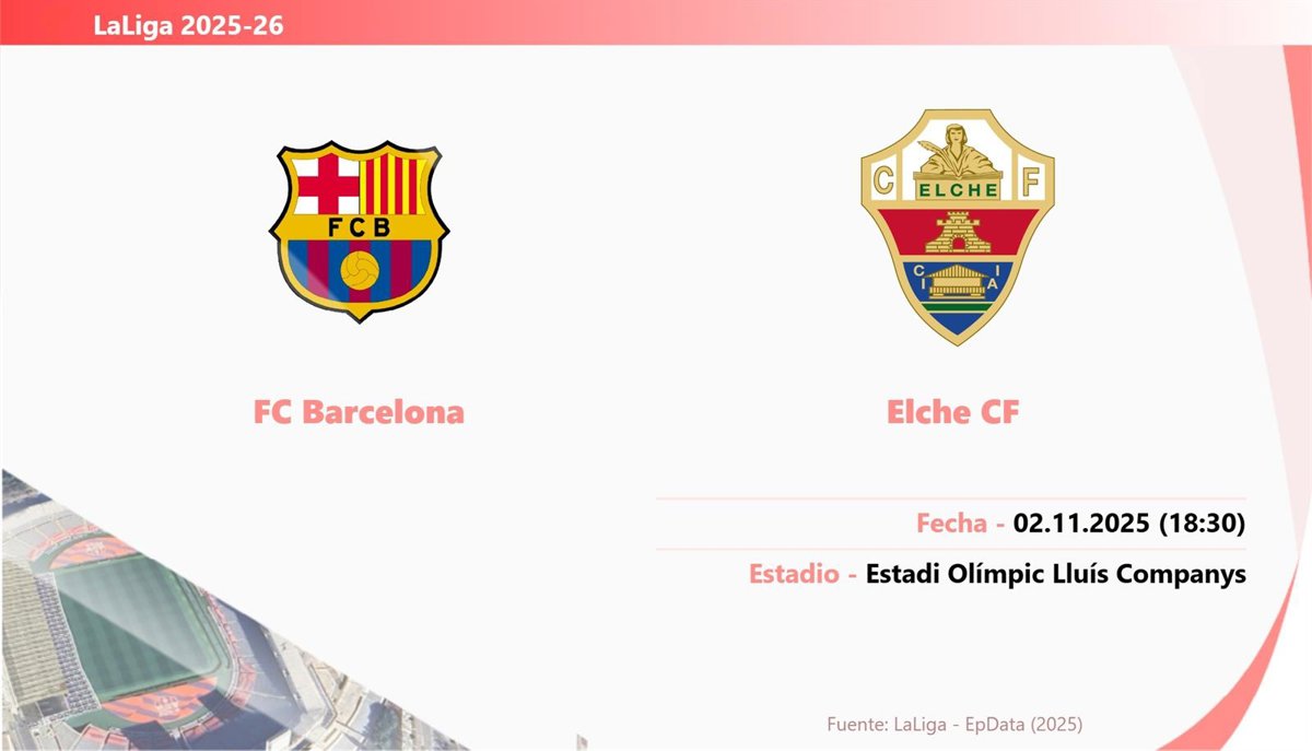 El partido que enfrenta a FC Barcelona y Elche de la jornada 11 de LaLiga EA Sports 2025-26 se disputará el domingo 2 de noviembre a las 18.30 horas en el estadio Lluís Companys.