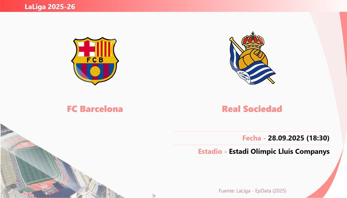 El partido que enfrenta a FC Barcelona y Real Sociedad de la jornada 7 de LaLiga EA Sports 2025-26 se disputará el sábado 28 de septiembre a las 18.30 horas en el Estadi Lluís Companys.