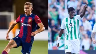El jugdor del FC Barcelona Fermín López, y el delantero del Real Betis Assane Diao. - EUROPA PRESS
