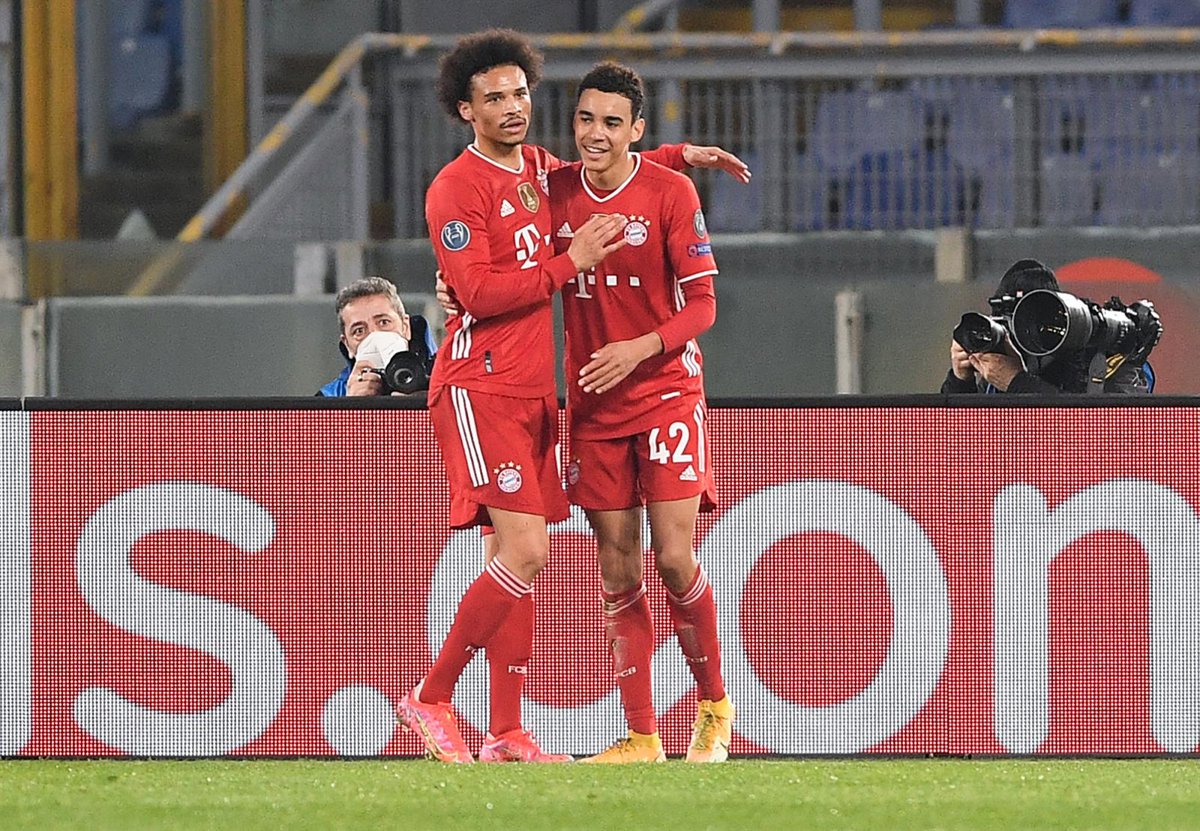 Leroy Sane (izda) felicita a Jamal Musiala por su gol en el Lazio-Bayern de octavos de final de la Liga de Campeones 2020-2021 - Giuseppe Maffia/dpa