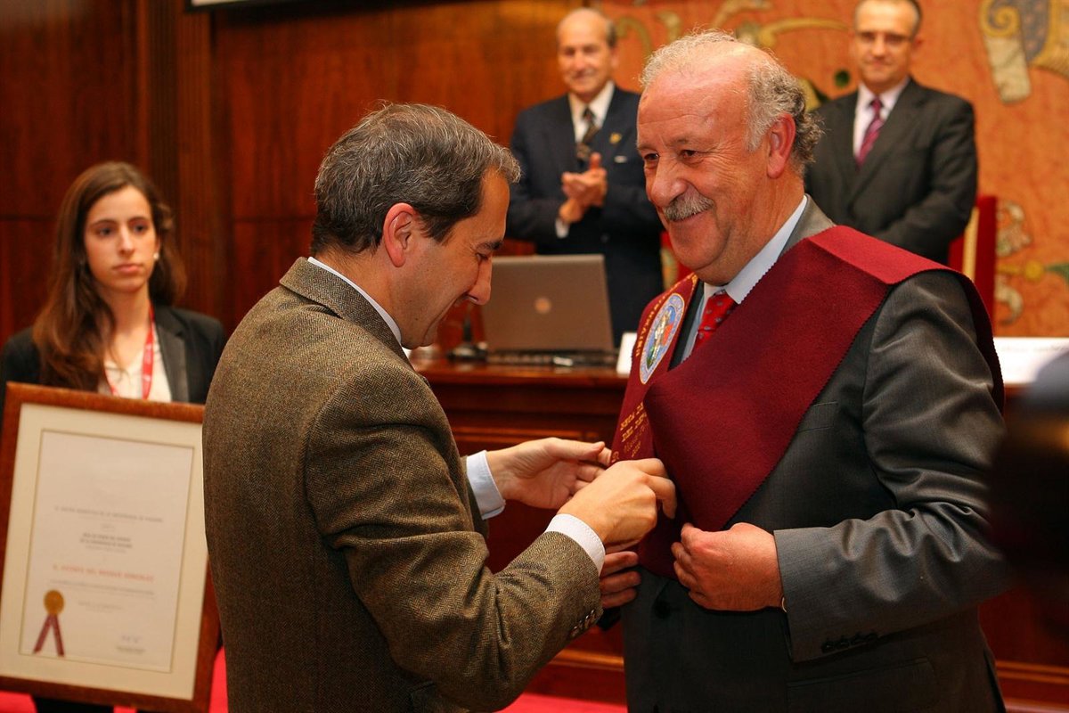El técnico de la selección española, Vicente del Bosque, ha sido obsequiado este martes con la Beca de Honor del Deporte que le han otorgado la Universidad de Navarra y la Academia Olímpica Española por ser "un claro representante del trabajo amable y de valores como el juego limpio y en equipo".