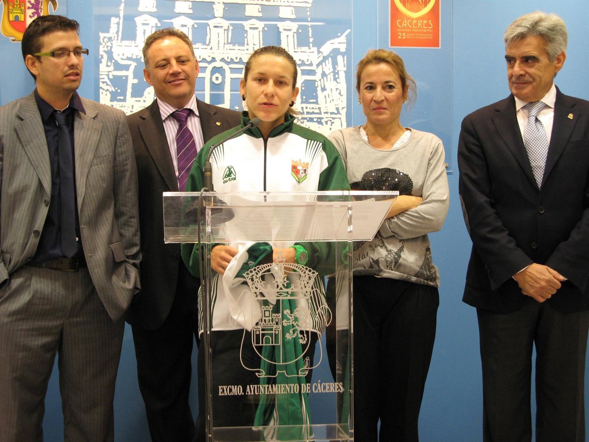 Carina Gomes ha sido presentada este martes en el Ayuntamiento de Cáceres con la presencia de la alcaldesa de la ciudad, Elena Nevado; el presidente de la Federación Extremeña de Fútbol, Juan de Dios Monterde; su vicepresidente, Pedro Rocha; y el vicepresidente del Club de Fútbol Femenino de Cáceres, Alberto Montes.