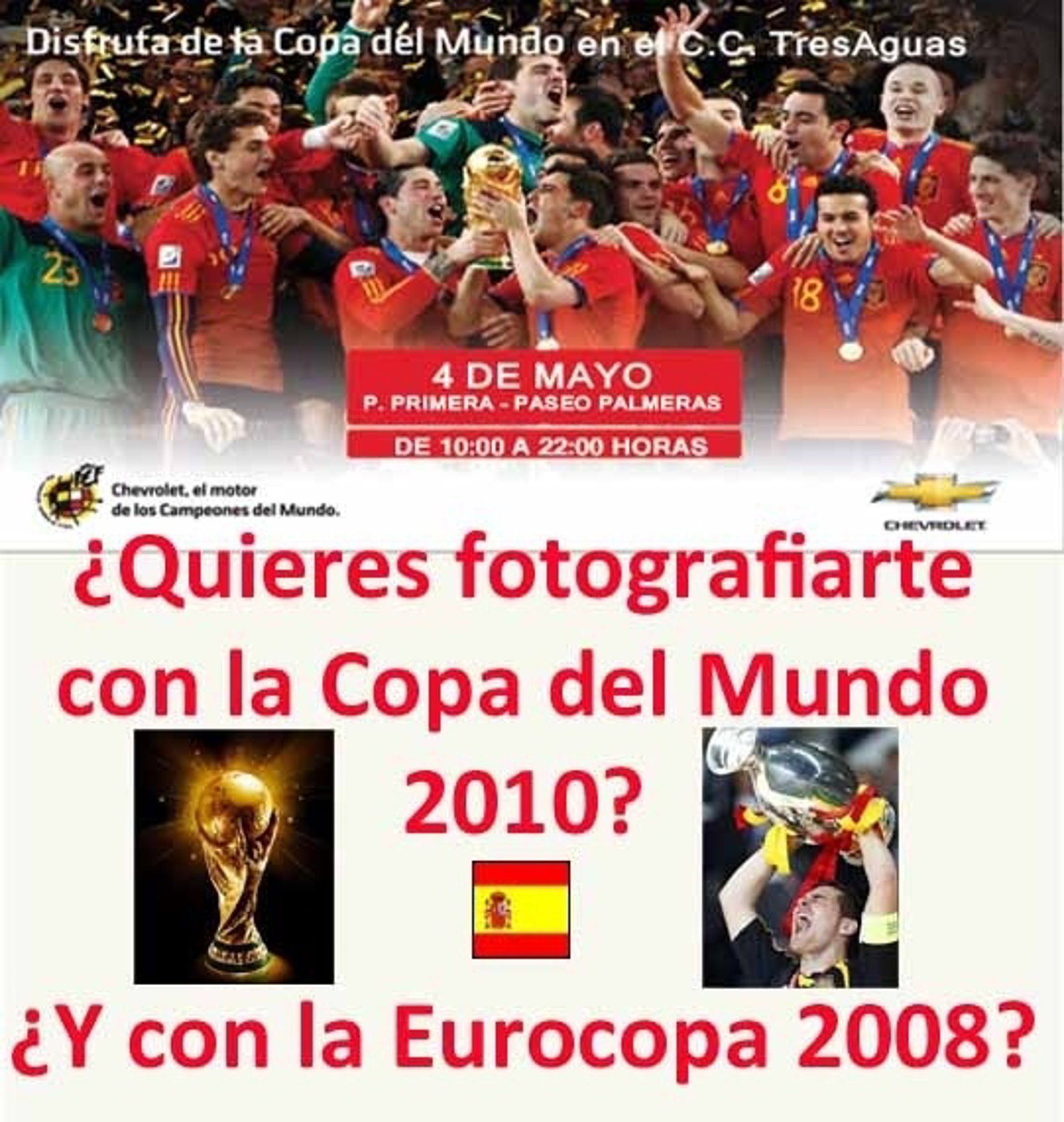 El centro comercial TresAguas expone el día 4 de mayo de 10 horas a 22 horas la Copa del Mundial de Fútbol 2010 y la Eurocopa del 2008, símbolo y orgullo para toda una generación. Todas las personas que se pasen por el TresAguas tienen una ocasión única para hacerse una foto personalizada de recuerdo junto a los trofeos.